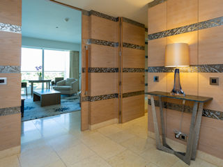 Takle in scenic views of the pool from the spacious private balcony of this Deluxe suite. The bedroom features a king bed, walk-in wardrobe and a 42-inch HD TV. The elegant living room contains an additional 42-inch HD TV with surround sound, an entertainment and media center, a DVD player and an MP3 music system. Unwind in the sleek marble bathroom with a separate bathtub with built-in TV, a rain shower, luxury bath products and cotton bathrobes and slippers. Enjoy a range of contemporary and convenient features, including WiFi access, a professional Nespresso coffee machine, a safe and a fully stocked bar. Approximately 70m2.