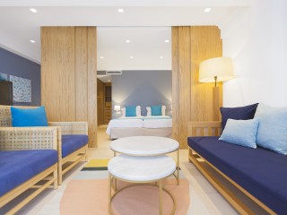 The Family Suite offers approximately 40 m² of luxurious and comfortable indoor space, featuring well-appointed spaces divided by a sliding door. This layout creates a separate sleeping area and a corner with a sofa bed, making it perfect for families with young children. It is equipped with air conditioning, double beds, a safety deposit box, a hairdryer, a mini bar, an espresso coffee machine, and a LED TV.
