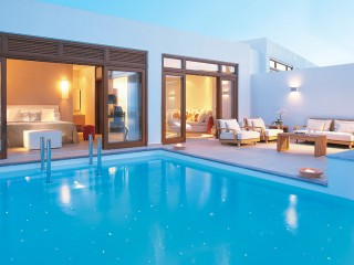 Deluxe Bungalow Suites enjoy a size of 45m² and a private heated swimming pool with sea view (on request: for temperature over 25 ºC an extra charge is required). The bedroom is stylish decorated and its king size bed has direct view to the sea. The generous bathroom consists of a shower cabin, two washbasins, a Jacuzzi bathtub with colour therapy, a 15" LCD TV and en-suite wardrobe. The private terrace with an outdoor lounging furniture overlooks the Cretan Waters.