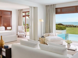 Indoor living space 75m² and outdoor living space 40-90m². These elegant and spacious villas are the ultimate choice for discerning travellers. Located directly on the exclusive beach they feature two bedrooms and are perfect for a family with a nanny or two couples. Includes one king-size bed, two single beds and an extra sofa bed, two bathrooms one luxurious sea view bathroom with a double stone basins, hydromassage bathtub with views to the sea and to the private pool, separate shower and 15' flat screen TV and one bathroom with noir washbasin and separate shower cabin. Also includes an infinity private heated pool 17-18, water temperature over 25ºC at an extra charge.